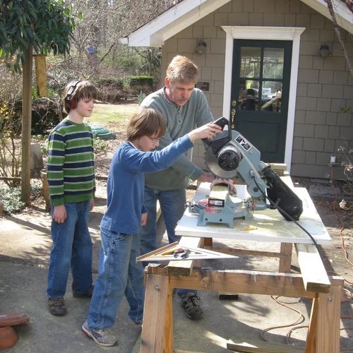 Once the location was decided, we had to research the type of coop that we wanted. Something fairly utilitarian and simple to build, but it had to look good too. Needless to say, there is lots and lots of information available on the web! The final design we chose to follow has a raised hen house inside a 6×10 pen. Raising the house allows room for the chickens to run underneath. Set roughly 30″ off the ground, it also allows for easy clean out and, most importantly, convenient egg retrieval! After looking at several options, we elected to add a corrugated metal roof over the whole thing to keep them dry in the event of the monsoon type rains we get during the summer. An antique stained glass window was pulled out of storage and adds a little bit of style! Building the coop filled several weekends during the transition from winter to spring. Enlisting the kids help was an easy way to get them outside – away from the computer and TV!