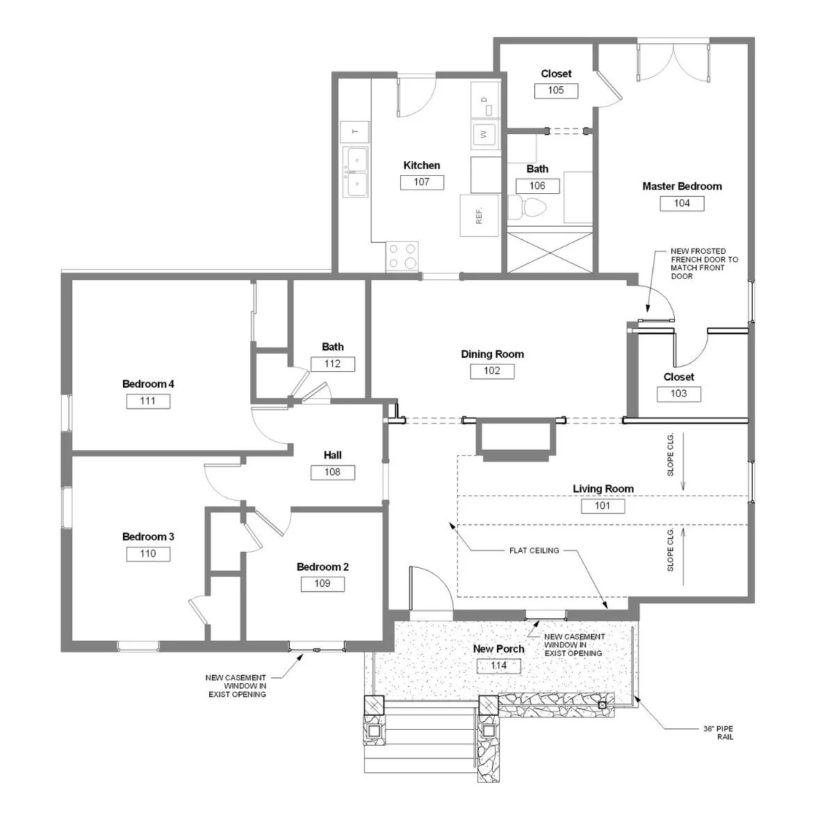 After a close evaluation of the existing plan, AD proposes to take half of the little porch area and convert it to a Master closet. He takes the other half and adds it to the living room. He also proposes vaulting the ceiling in the living area to give it more height. Trend is a little concerned about losing some attic storage, but after a little analytical discussion about “why?”, he chooses volume. AD has long ago learned that “why” is the most important question that can be asked of a client. (The client can always tell you “what” they want, but “why” unveils true motivations, often leading to drastically different solutions!) The living room ceiling becomes vaulted!