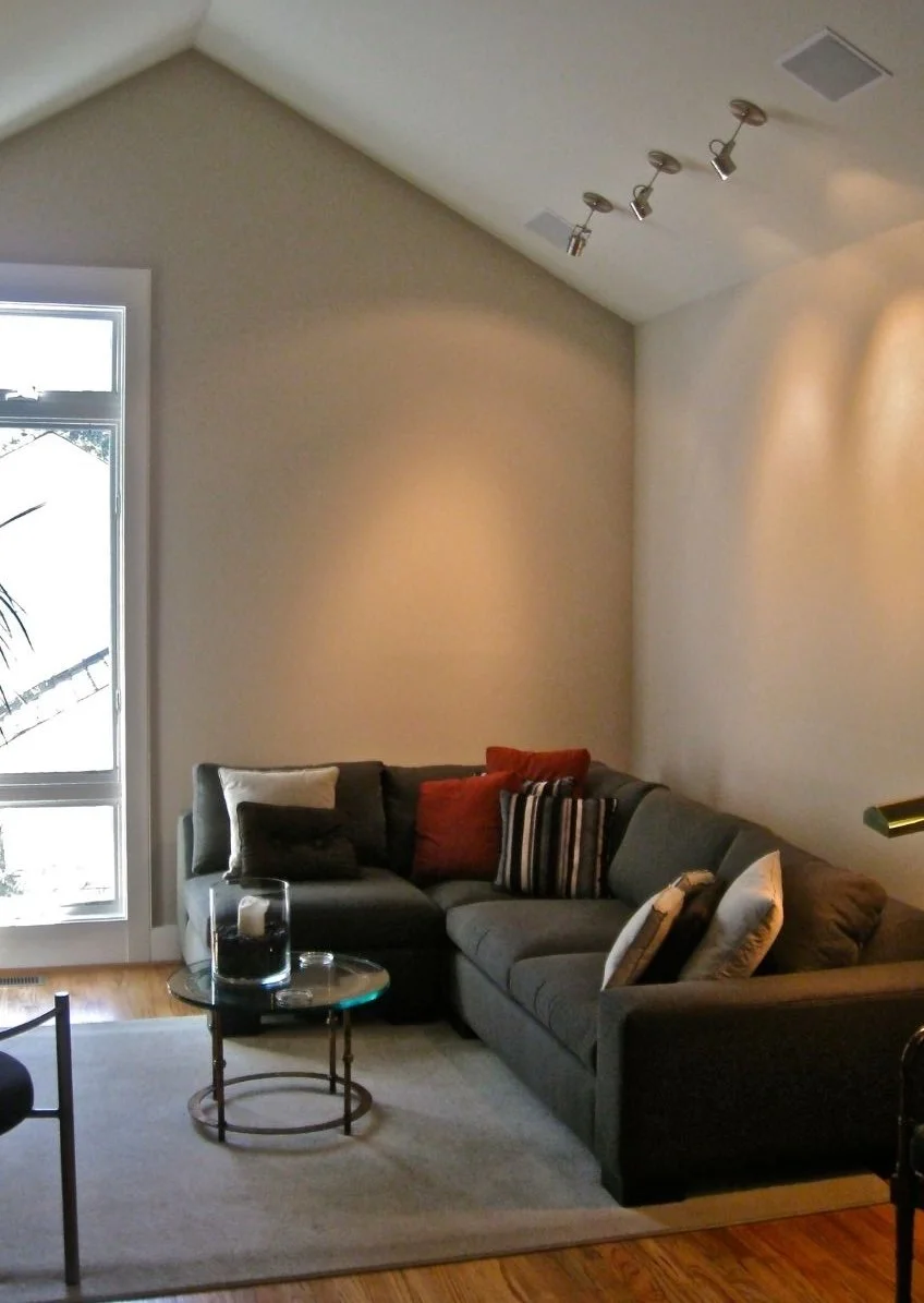 The former porch is captured in the Living Room space and tied together with a vaulted ceiling. Off-center tall window allows for furniture placement, light, and art walls.