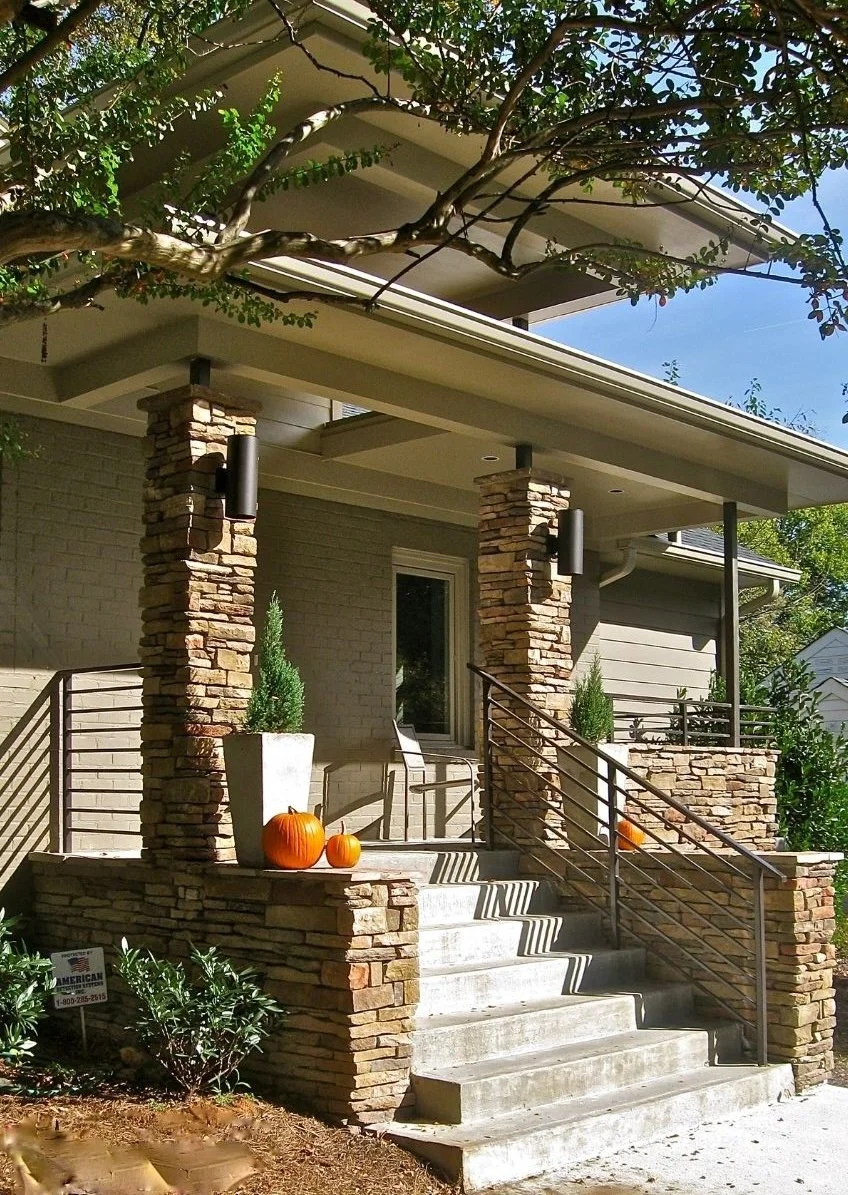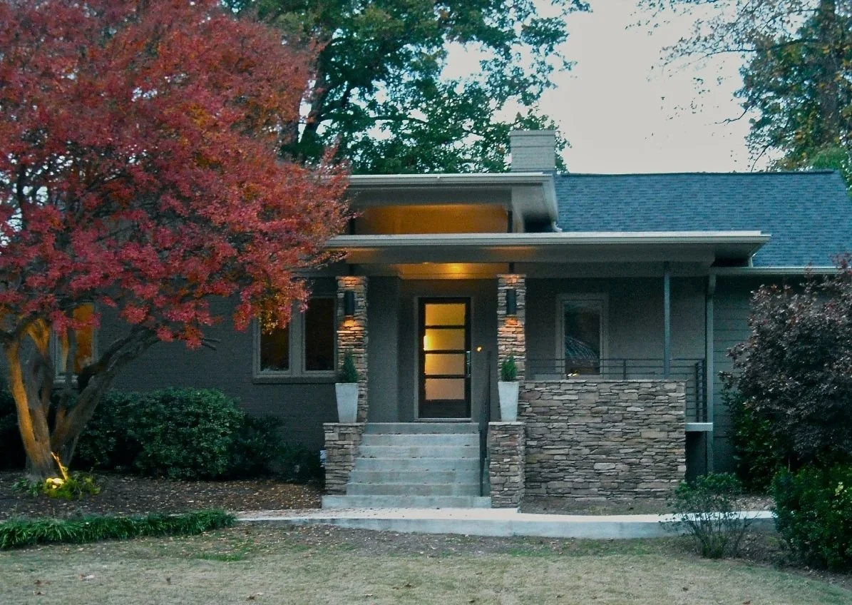 Finally, to the porch. Trend wants the entry to feel taller and lighter. AD listens and comes up with a creative system of floating roof planes that balance a heavy stone base. The resulting asymmetrical composition and neutral, earthy colors balance and complement the living sculpture of the crepe myrtle. The floating planes allow light to penetrate the porch and create some dramatic shadow play. At night, an uplight focused on the underside of the upper plane provides a welcoming glow at the entry. The two can lights on the exterior stone columns flanking the stairs provide a wonderful accent, illuminating the texture of the stone. The arrangement of the stairs naturally flows toward the drive, providing a graceful and natural entry path for the owner and his guests.