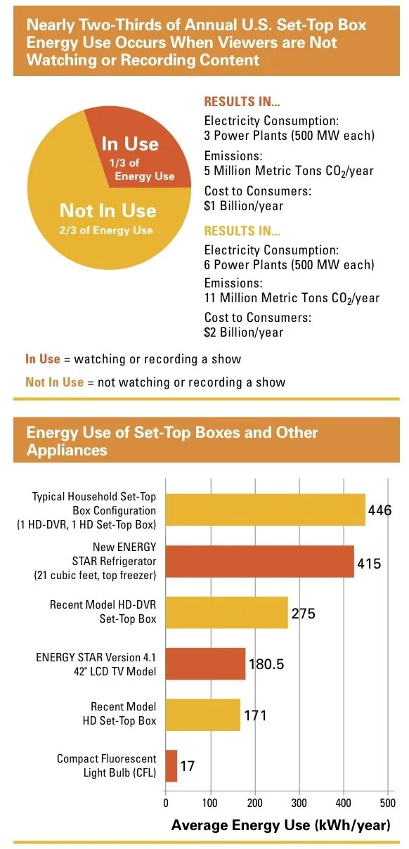 As a follow-up to the first post of the year, a simple resolution , I was reminded and nudged into action by this article in the June 25th New York Times. It basically reminded me that a cable box is always on and then clubbed me over the head with the fact that this innocuous device consumes about as much power as a 21 cubic foot refrigerator! We have 3! In a recent study, by the Natural Resources Defense Council, “it was concluded that the boxes consumed $3 billion in electricity per year in the United States — and that 66 percent of that power is wasted when no one is watching and shows are not being recorded. That is more power than the state of Maryland uses over 12 months.” That is a staggering statistic!