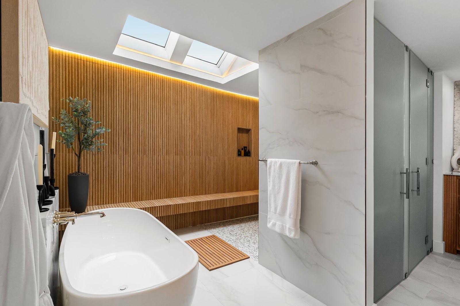 Through the course of my career I’ve designed a lot of bathrooms and after the kitchen they are some of the most design intensive spaces of a project. Whether they’re new build houses, whole house renovations or just a simple bathroom remodel, the common theme is that clients want to bring the spa experience into their home. Their goal is to create a calm, soothing escape from the hustle and bustle of daily life, and we can all get on board with that!